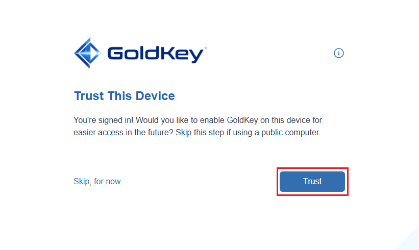Your next screen will say that your GoldKey token has been activated and ask if you would like to trust the device. If you are logging in on a personal device, select “Trust”.