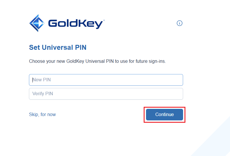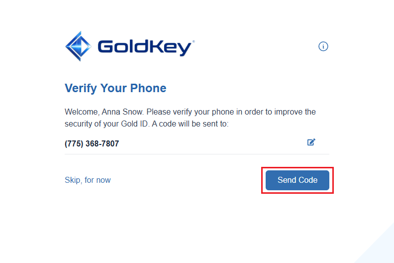 Your last step will be to verify your phone number. We recommend doing this now, rather than skipping this step. Skipping this step will result in a prompt to do so every time you sign in. On the following page, you will receive a 6-digit code via text from GoldKey. Enter the code in the box and click “Verify.”